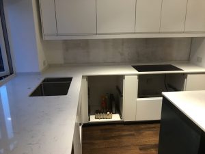 An L Shape kitchen featuring an island in the middle that has been finished with the beautiful and classy Attica White Carrera. The Attica White Carrera is a white quartz that has an marble effect throughout with a blue vein. It only went on sale in September 2017 and is already proving a major hit. It is a great alternative to the popular White Attica by Caesarstone 5143.